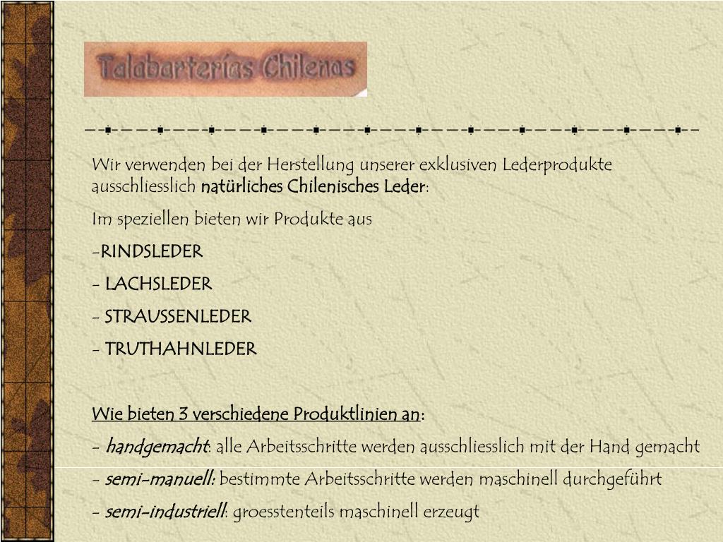 Wir verwenden bei der Herstellung unserer exklusiven Lederprodukte ausschliesslich natürliches Chilenisches Leder: • Im speziellen bieten wir Produkte aus • RINDSLEDER • LACHSLEDER • STRAUSSENLEDER • TRUTHAHNLEDER • Wie bieten 3 verschiedene Produktlinien an: • handgemacht: alle Arbeitsschritte werden ausschliesslich mit der Hand gemacht • semi-manuell: bestimmte Arbeitsschritte werden maschinell durchgeführt • semi-industriell: groesstenteils maschinell erzeugt