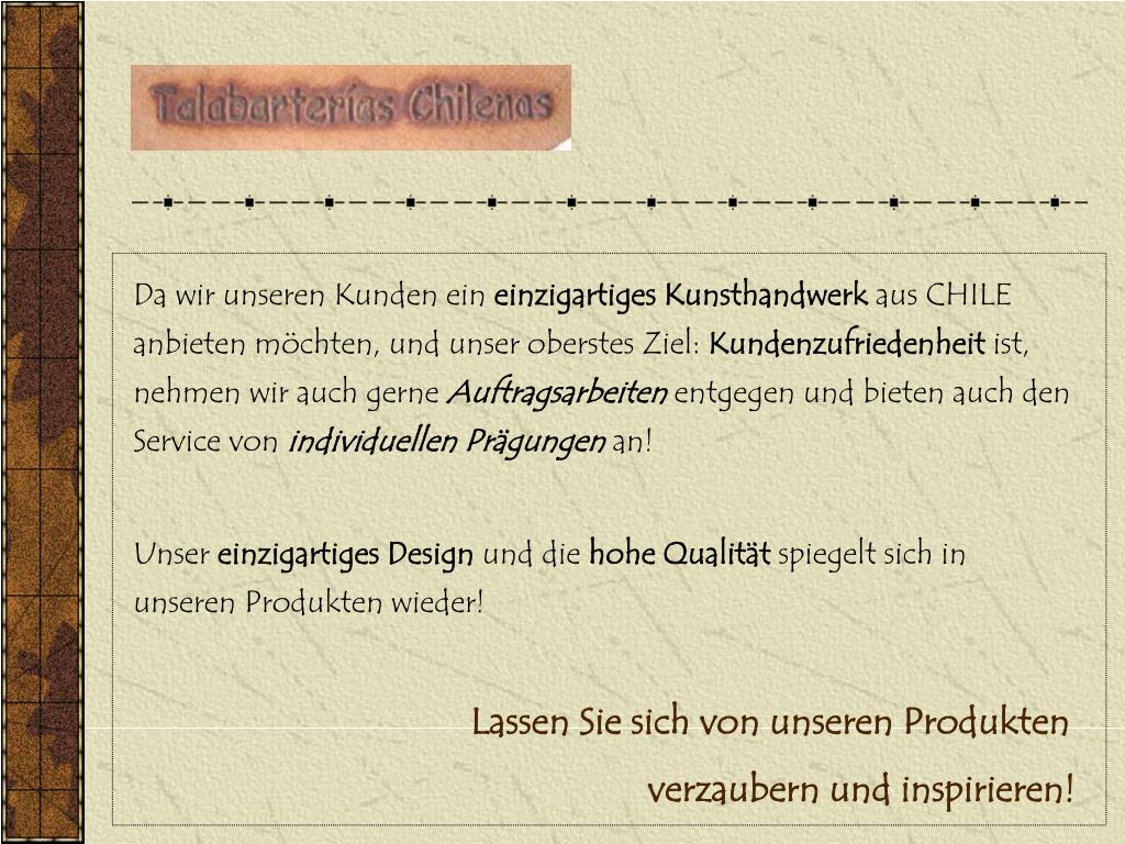 Da wir unseren Kunden ein einzigartiges Kunsthandwerk aus CHILE anbieten möchten, und unser oberstes Ziel: Kundenzufriedenheit ist, nehmen wir auch gerne Auftragsarbeiten entgegen und bieten auch den Service von individuellen Prägungen an! Unser einzigartiges Design und die hohe Qualität spiegelt sich in unseren Produkten wieder! Lassen Sie sich von unseren Produkten verzaubern und inspirieren!