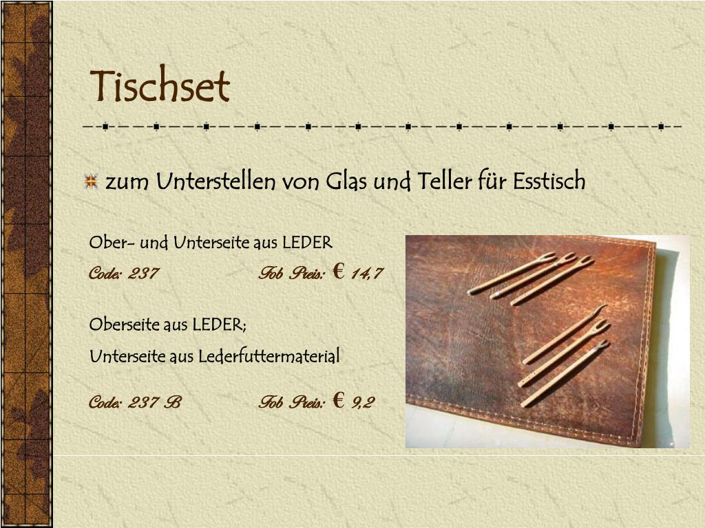 Tischset • zum Unterstellen von Glas und Teller für Esstisch Ober- und Unterseite aus LEDER Code: 237 Fob Preis: €14,7 Oberseite aus LEDER; Unterseite aus Lederfuttermaterial Code: 237 B Fob Preis: €9,2