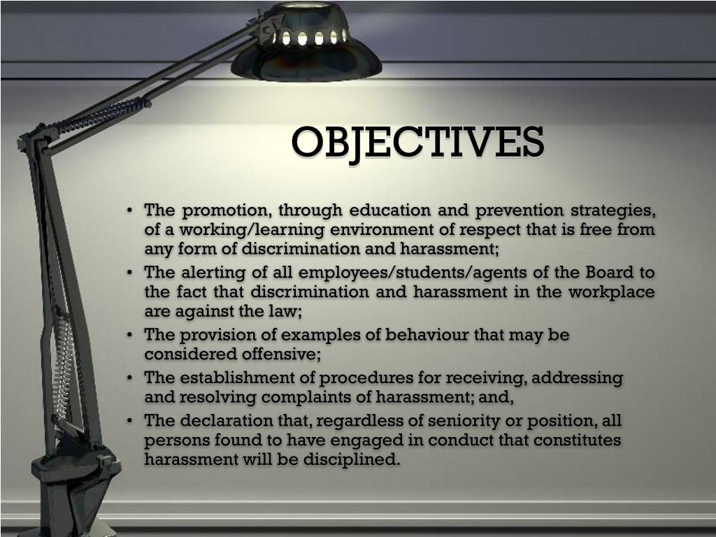 OBJECTIVES • The promotion, through education and prevention strategies, of a working/learning environment of respect that is free from any form of discrimination and harassment; • The alerting of all employees/students/agents of the Board to the fact that discrimination and harassment in the workplace are against the law; • The provision of examples of behaviour that may be considered offensive; • The establishment of procedures for receiving, addressing and resolving complaints of harassment; and, • The declaration that, regardless of seniority or position, all persons found to have engaged in conduct that constitutes harassment will be disciplined.