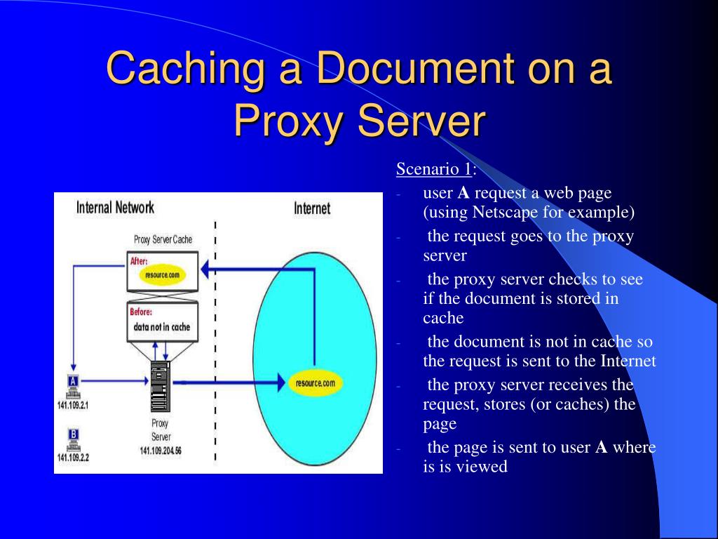 Caching a Document on a Proxy Server Scenario 1: • user A request a web page (using Netscape for example) • the request goes to the proxy server • the proxy server checks to see if the document is stored in cache • the document is not in cache so the request is sent to the Internet • the proxy server receives the request, stores (or caches) the page • the page is sent to user A where is is viewed
