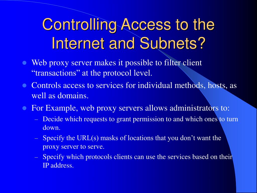 Controlling Access to the Internet and Subnets? • Web proxy server makes it possible to filter client “transactions” at the protocol level. • Controls access to services for individual methods, hosts, as well as domains. • For Example, web proxy servers allows administrators to: • Decide which requests to grant permission to and which ones to turn down. • Specify the URL(s) masks of locations that you don’t want the proxy server to serve. • Specify which protocols clients can use the services based on their IP address.