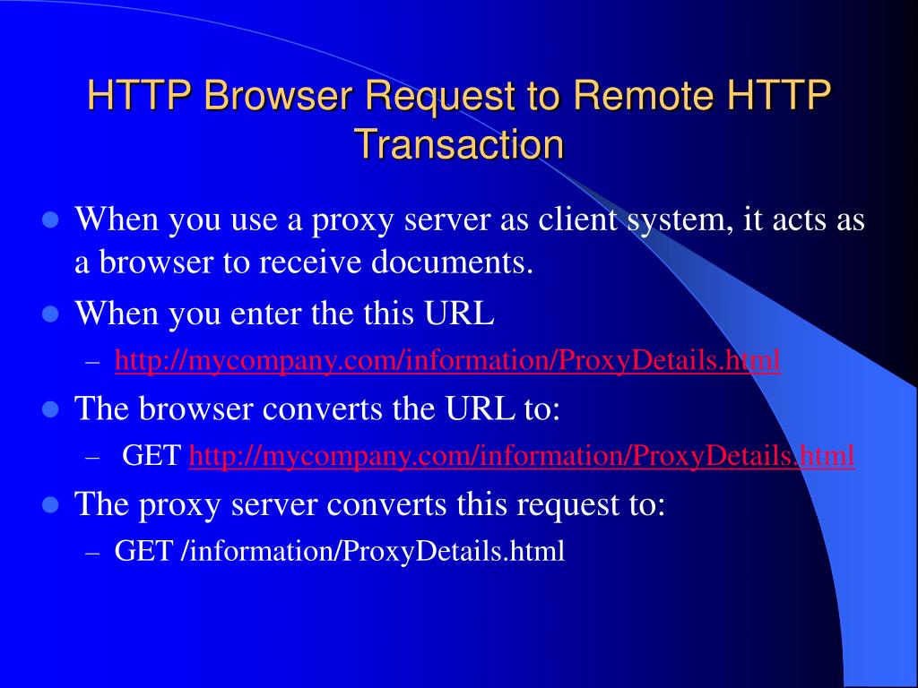 HTTP Browser Request to Remote HTTP Transaction • When you use a proxy server as client system, it acts as a browser to receive documents. • When you enter the this URL • http://mycompany.com/information/ProxyDetails.html • The browser converts the URL to: • GET http://mycompany.com/information/ProxyDetails.html • The proxy server converts this request to: • GET /information/ProxyDetails.html