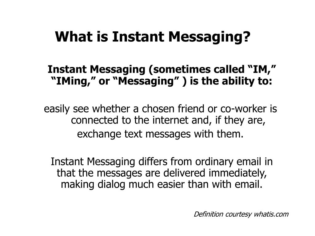 What is Instant Messaging? • Instant Messaging (sometimes called “IM,” “IMing,” or “Messaging” ) is the ability to: • easily see whether a chosen friend or co-worker is connected to the internet and, if they are, • exchange text messages with them. • Instant Messaging differs from ordinary email in that the messages are delivered immediately, making dialog much easier than with email. Definition courtesy whatis.com