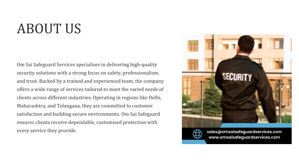 ABOUT US Om Sai Safeguard Services specialises in delivering high-quality security solutions with a strong focus on safety, professionalism, and trust. Backed by a trained and experienced team, the company offers a wide range of services tailored to meet the varied needs of clients across different industries. Operating in regions like Delhi, Maharashtra, and Telangana, they are committed to customer satisfaction and building secure environments. Om Sai Safeguard ensures clients receive dependable, customised protection with every service they provide.