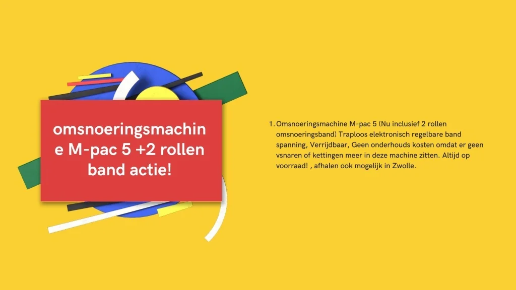 1. OmsnoeringsmachineM-pac5 (Nuinclusief2rollen omsnoeringsband) Traplooselektronischregelbareband spanning, Verrijdbaar, Geenonderhoudskostenomdatergeen vsnarenofkettingenmeerindezemachinezitten. Altijdop voorraad! , afhalenookmogelijkinZwolle. omsnoeringsmachin eM-pac5 +2rollen bandactie!