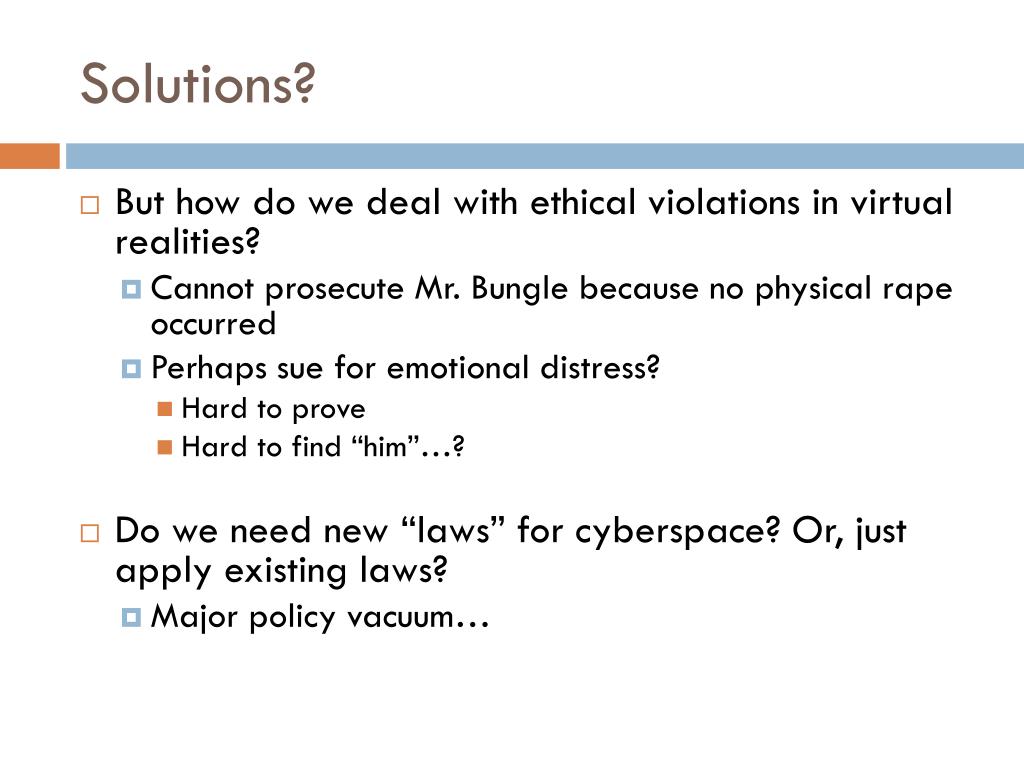 Solutions? • But how do we deal with ethical violations in virtual realities? • Cannot prosecute Mr. Bungle because no physical rape occurred • Perhaps sue for emotional distress? • Hard to prove • Hard to find “him”…? • Do we need new “laws” for cyberspace? Or, just apply existing laws? • Major policy vacuum…