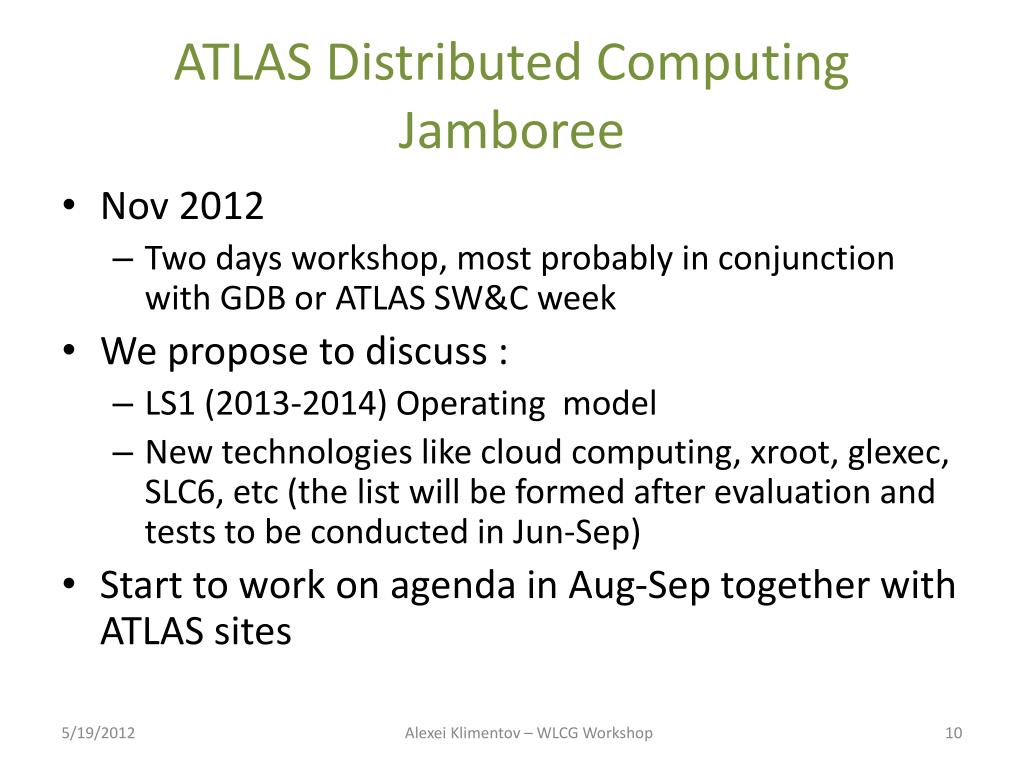 ATLAS Distributed Computing Jamboree • Nov 2012 • Two days workshop, most probably in conjunction with GDB or ATLAS SW&C week • We propose to discuss : • LS1 (2013-2014) Operating model • New technologies like cloud computing, xroot, glexec, SLC6, etc(the list will be formed after evaluation and tests to be conducted in Jun-Sep) • Start to work on agenda in Aug-Sep together with ATLAS sites Alexei Klimentov – WLCG Workshop