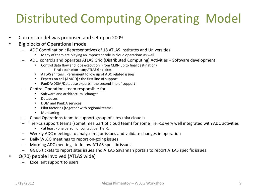 Distributed Computing Operating Model • Current model was proposed and set up in 2009 • Big blocks of Operational model • ADC Coordination : Representatives of 18 ATLAS Institutes and Universities • Many of them are playing an important role in cloud operations as well • ADC controls and operates ATLAS Grid (Distributed Computing) Activities + Software development • Control data flow and jobs execution (From CERN up to final destination) • Final destination – any ATLAS Grid sites • ATLAS shifters : Permanent follow up of ADC related issues • Experts on call (AMOD) : the first line of support • PanDA/DDM/Database experts : the second line of support • Central Operations team responsible for • Software and architectural changes • Databases • DDM and PanDA services • Pilot factories (together with regional teams) • Monitoring • Cloud Operations team to support group of sites (aka clouds) • Tier-1s support teams (sometimes part of cloud team) for some Tier-1s very well integrated with ADC activities • <at least> one person of contact per Tier-1 • Weekly ADC meetings to analyse major issues and validate changes in operation • Daily WLCG meetings to report on-going issues • Morning ADC meetings to follow ATLAS specific issues • GGUS tickets to report sites issues and ATLAS Savannah portals to report ATLAS specific issues • O(70) people involved (ATLAS wide) • Excellent support to users Alexei Klimentov – WLCG Workshop