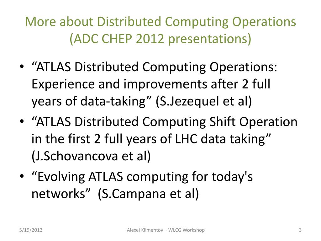 More about Distributed Computing Operations(ADC CHEP 2012 presentations) • “ATLAS Distributed Computing Operations: Experience and improvements after 2 full years of data-taking” (S.Jezequel et al) • “ATLAS Distributed Computing Shift Operation in the first 2 full years of LHC data taking” (J.Schovancova et al) • “Evolving ATLAS computing for today's networks” (S.Campana et al) Alexei Klimentov – WLCG Workshop