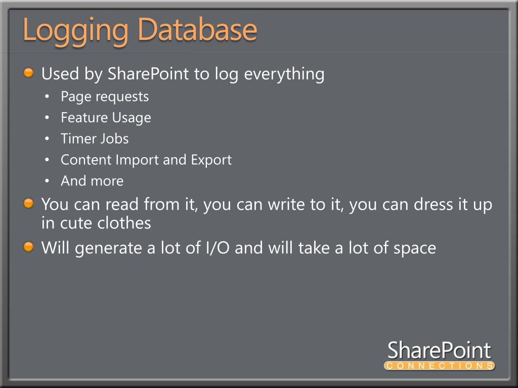 Logging Database • Used by SharePoint to log everything • Page requests • Feature Usage • Timer Jobs • Content Import and Export • And more • You can read from it, you can write to it, you can dress it up in cute clothes • Will generate a lot of I/O and will take a lot of space