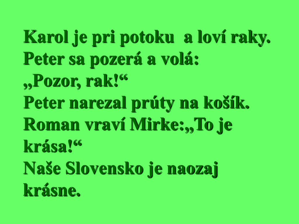 Karol je pri potoku a loví raky. Peter sa pozerá a volá:,,Pozor, rak!“Peter narezal prúty na košík.Roman vraví Mirke:,,To je krása!“Naše Slovensko je naozaj krásne.