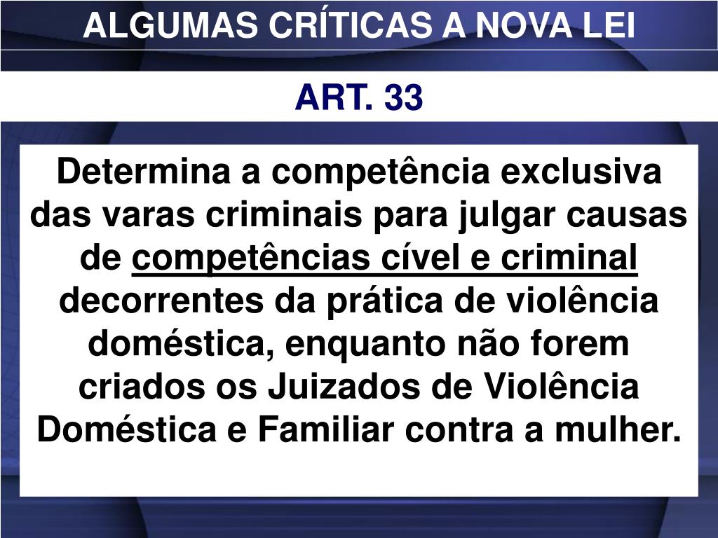 ALGUMAS CRÍTICAS A NOVA LEI ART. 33 Determina a competência exclusiva das varas criminais para julgar causas de competências cível e criminal decorrentes da prática de violência doméstica, enquanto não forem criados os Juizados de Violência Doméstica e Familiar contra a mulher.