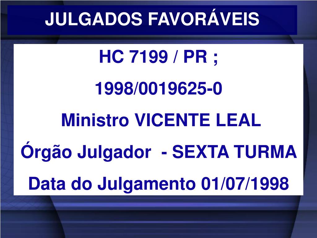 JULGADOS FAVORÁVEIS HC 7199 / PR ; 1998/0019625-0 Ministro VICENTE LEAL Órgão Julgador - SEXTA TURMA Data do Julgamento 01/07/1998