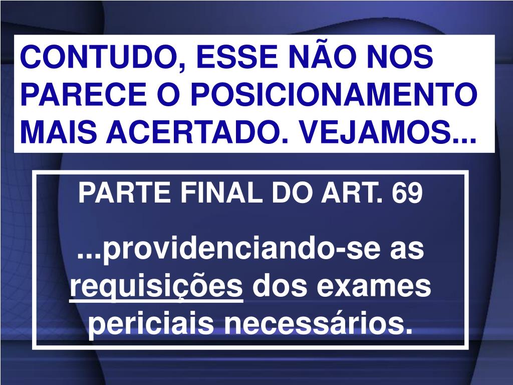 CONTUDO, ESSE NÃO NOS PARECE O POSICIONAMENTO MAIS ACERTADO. VEJAMOS... PARTE FINAL DO ART. 69 ...providenciando-se as requisições dos exames periciais necessários.