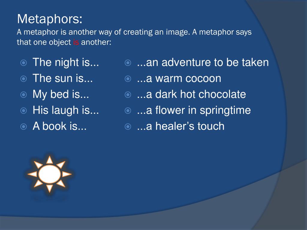 Metaphors:A metaphor is another way of creating an image. A metaphor says that one object is another: • The night is... • The sun is... • My bed is... • His laugh is... • A book is... • ...an adventure to be taken • ...a warm cocoon • ...a dark hot chocolate • ...a flower in springtime • ...a healer’s touch