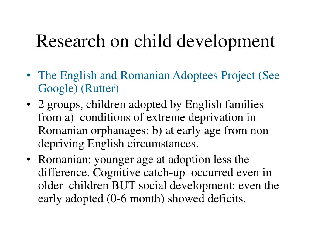 Research on child development • The English and Romanian Adoptees Project (See Google) (Rutter) • 2 groups, children adopted by English families from a) conditions of extreme deprivation in Romanian orphanages: b) at early age from non depriving English circumstances. • Romanian: younger age at adoption less the difference. Cognitive catch-up occurred even in older children BUT social development: even the early adopted (0-6 month) showed deficits.