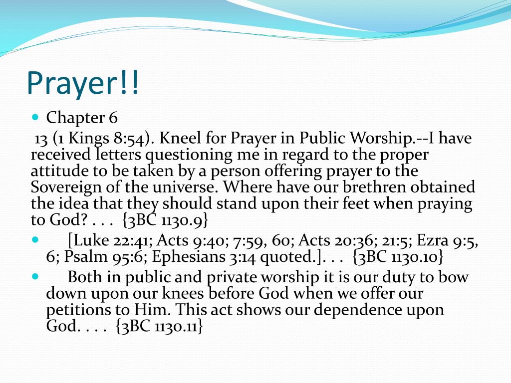 Prayer!! • Chapter 6 13 (1 Kings 8:54). Kneel for Prayer in Public Worship.--I have received letters questioning me in regard to the proper attitude to be taken by a person offering prayer to the Sovereign of the universe. Where have our brethren obtained the idea that they should stand upon their feet when praying to God? . . . {3BC 1130.9} • [Luke 22:41; Acts 9:40; 7:59, 60; Acts 20:36; 21:5; Ezra 9:5, 6; Psalm 95:6; Ephesians 3:14 quoted.]. . . {3BC 1130.10} • Both in public and private worship it is our duty to bow down upon our knees before God when we offer our petitions to Him. This act shows our dependence upon God. . . . {3BC 1130.11}