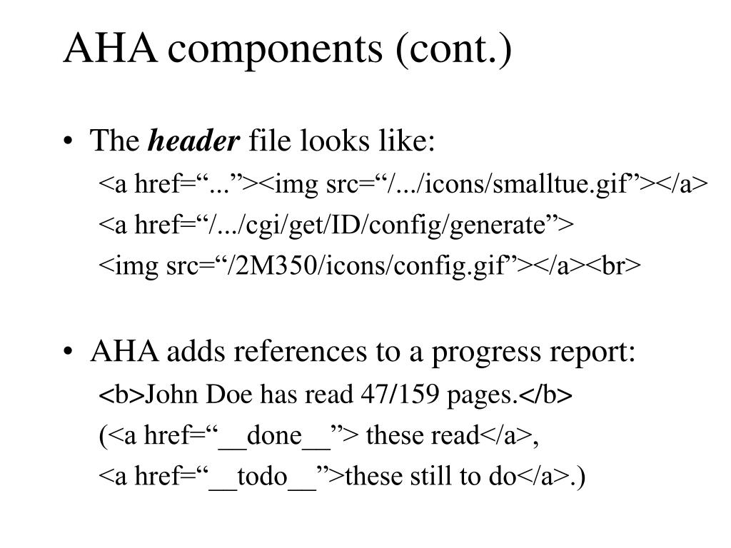 AHA components (cont.) • The header file looks like: <a href=“...”><img src=“/.../icons/smalltue.gif”></a> <a href=“/.../cgi/get/ID/config/generate”> <img src=“/2M350/icons/config.gif”></a><br> • AHA adds references to a progress report: <b>John Doe has read 47/159 pages.</b> (<a href=“__done__”> these read</a>, <a href=“__todo__”>these still to do</a>.)