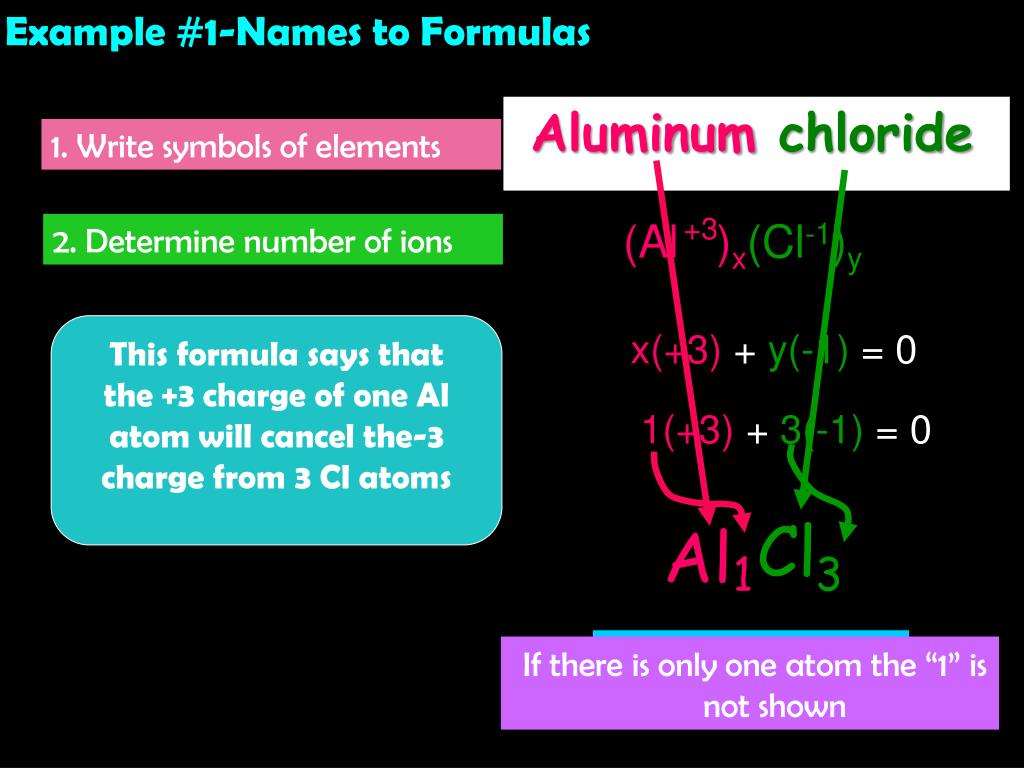 Example #1-Names to Formulas Aluminumchloride 1. Write symbols of elements (Al )x(Cl-1)y +3 2. Determine number of ions This formula says that the +3 charge of one Al atom will cancel the-3 charge from 3 Cl atoms x(+3) +y(-1) = 0 1(+3) +3(-1) = 0 Cl Al 3 1 Final Formula If there is only one atom the “1” is not shown