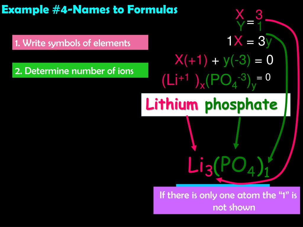 Example #4-Names to Formulas X3 = Y1 Lithium phosphate 1X = 3y 1. Write symbols of elements X(+1) + y(-3) = 0 2. Determine number of ions (Li )x(PO4-3)y= 0 +1 PO4 Li ( )1 3 Final Formula If there is only one atom the “1” is not shown