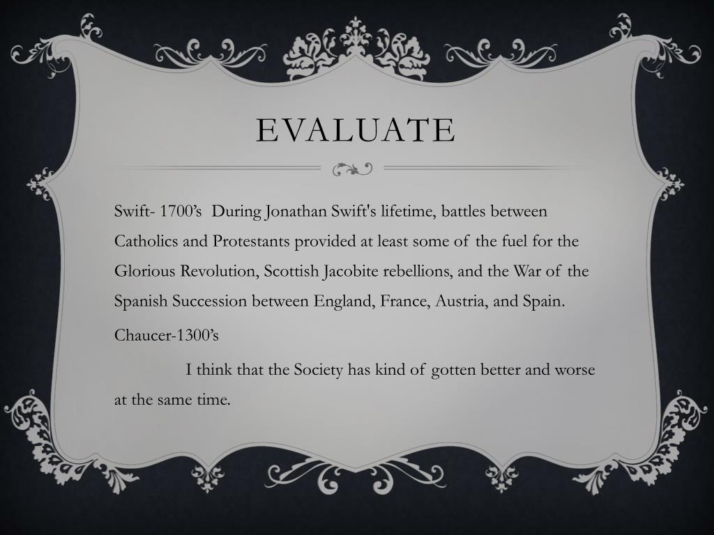 Evaluate Swift- 1700’s During Jonathan Swift's lifetime, battles between Catholics and Protestants provided at least some of the fuel for the Glorious Revolution, Scottish Jacobite rebellions, and the War of the Spanish Succession between England, France, Austria, and Spain. Chaucer-1300’s I think that the Society has kind of gotten better and worse at the same time.