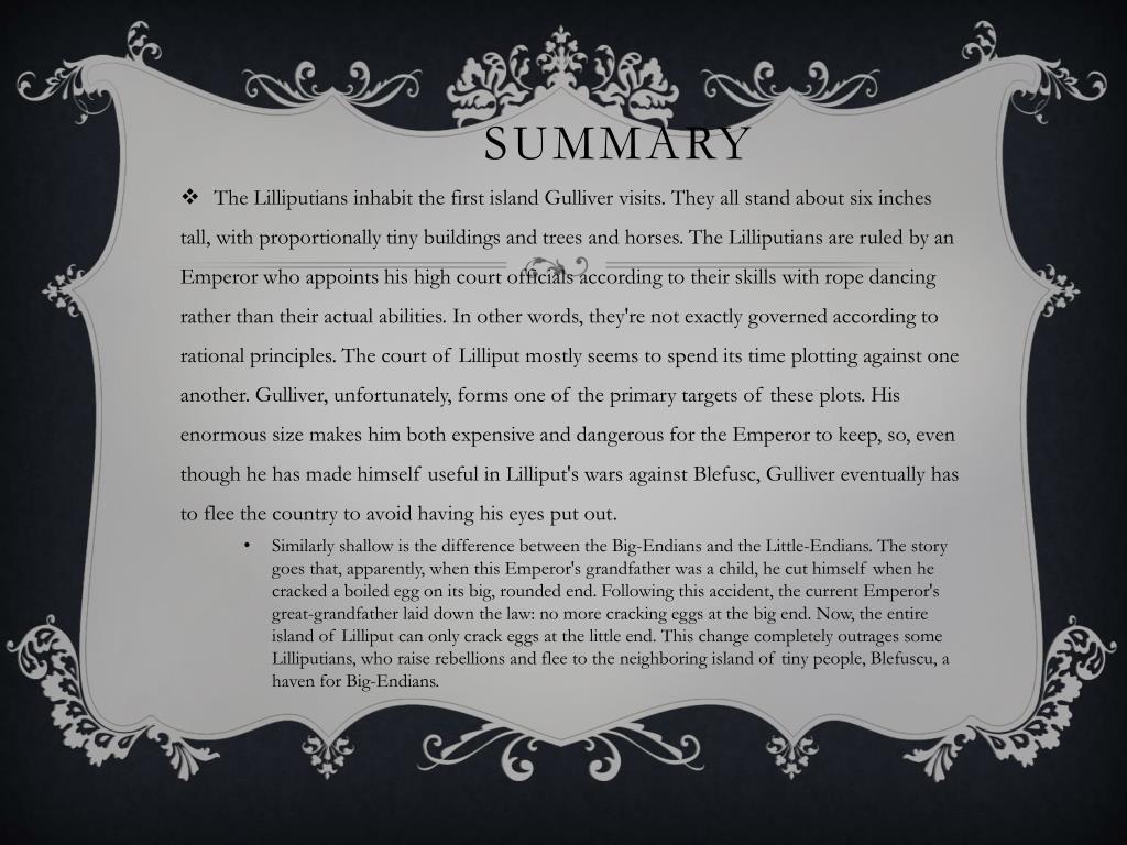 Summary • The Lilliputians inhabit the first island Gulliver visits. They all stand about six inches tall, with proportionally tiny buildings and trees and horses. The Lilliputians are ruled by an Emperor who appoints his high court officials according to their skills with rope dancing rather than their actual abilities. In other words, they're not exactly governed according to rational principles. The court of Lilliput mostly seems to spend its time plotting against one another. Gulliver, unfortunately, forms one of the primary targets of these plots. His enormous size makes him both expensive and dangerous for the Emperor to keep, so, even though he has made himself useful in Lilliput's wars against Blefusc, Gulliver eventually has to flee the country to avoid having his eyes put out. • Similarly shallow is the difference between the Big-Endians and the Little-Endians. The story goes that, apparently, when this Emperor's grandfather was a child, he cut himself when he cracked a boiled egg on its big, rounded end. Following this accident, the current Emperor's great-grandfather laid down the law: no more cracking eggs at the big end. Now, the entire island of Lilliput can only crack eggs at the little end. This change completely outrages some Lilliputians, who raise rebellions and flee to the neighboring island of tiny people, Blefuscu, a haven for Big-Endians.