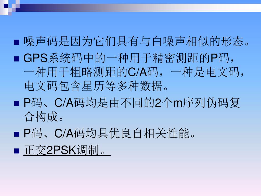 噪声码是因为它们具有与白噪声相似的形态。 • GPS系统码中的一种用于精密测距的P码,一种用于粗略测距的C/A码,一种是电文码,电文码包含星历等多种数据。 • P码、C/A码均是由不同的2个m序列伪码复合构成。 • P码、C/A码均具优良自相关性能。 • 正交2PSK调制。