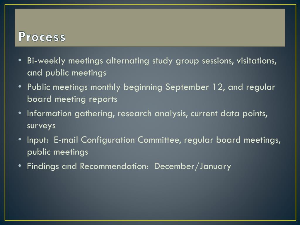 Process • Bi-weekly meetings alternating study group sessions, visitations, and public meetings • Public meetings monthly beginning September 12, and regular board meeting reports • Information gathering, research analysis, current data points, surveys • Input: E-mail Configuration Committee, regular board meetings, public meetings • Findings and Recommendation: December/January