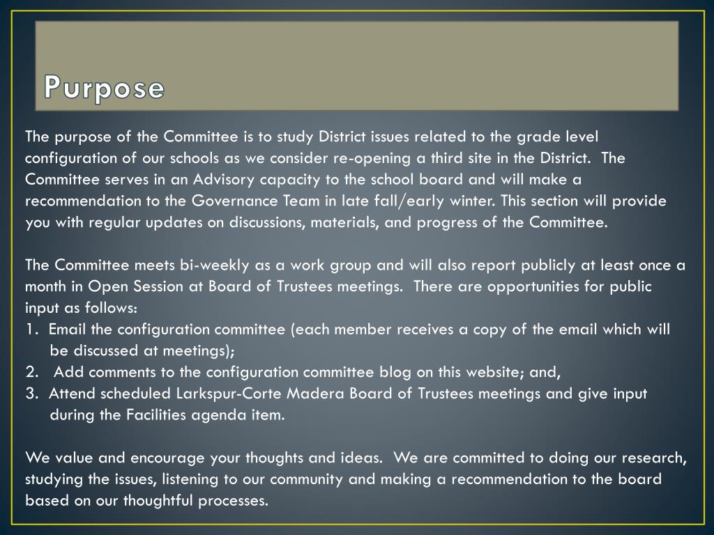 The purpose of the Committee is to study District issues related to the grade level configuration of our schools as we consider re-opening a third site in the District. The Committee serves in an Advisory capacity to the school board and will make a recommendation to the Governance Team in late fall/early winter. This section will provide you with regular updates on discussions, materials, and progress of the Committee. The Committee meets bi-weekly as a work group and will also report publicly at least once a month in Open Session at Board of Trustees meetings. There are opportunities for public input as follows: 1. Email the configuration committee (each member receives a copy of the email which will be discussed at meetings);2. Add comments to the configuration committee blog on this website; and, 3. Attend scheduled Larkspur-Corte Madera Board of Trustees meetings and give input during the Facilities agenda item.We value and encourage your thoughts and ideas. We are committed to doing our research, studying the issues, listening to our community and making a recommendation to the board based on our thoughtful processes. Purpose