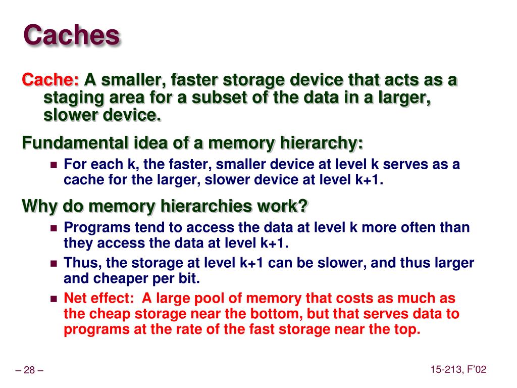 Caches Cache: A smaller, faster storage device that acts as a staging area for a subset of the data in a larger, slower device. Fundamental idea of a memory hierarchy: • For each k, the faster, smaller device at level k serves as a cache for the larger, slower device at level k+1. Why do memory hierarchies work? • Programs tend to access the data at level k more often than they access the data at level k+1. • Thus, the storage at level k+1 can be slower, and thus larger and cheaper per bit. • Net effect: A large pool of memory that costs as much as the cheap storage near the bottom, but that serves data to programs at the rate of the fast storage near the top.