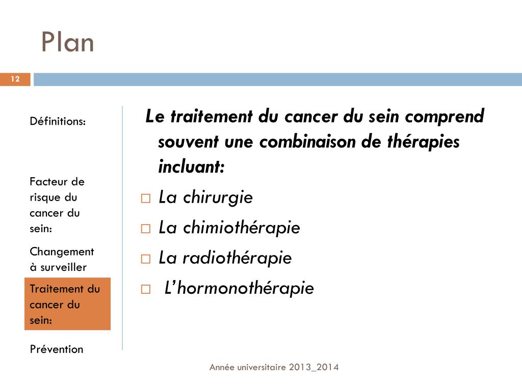 Plan Le traitement du cancer du sein comprend souvent une combinaison de thérapies incluant: • La chirurgie • La chimiothérapie • La radiothérapie • L’hormonothérapie Définitions: Facteur de risque du cancer du sein: Changement à surveiller Traitement du cancer du sein: Prévention Année universitaire 2013_2014