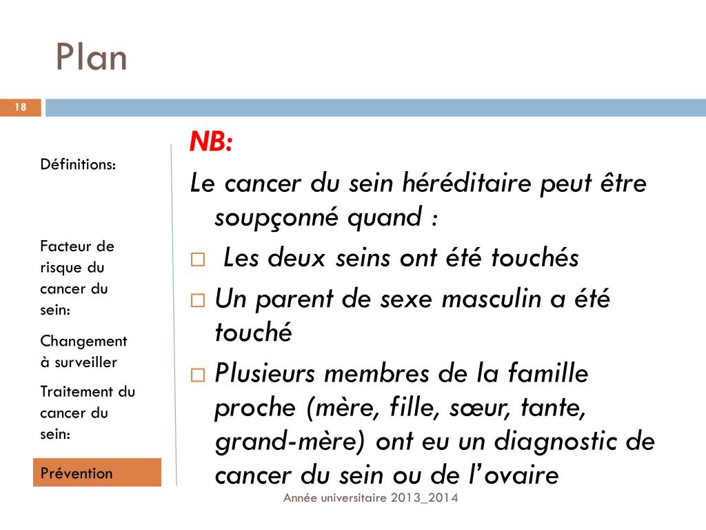Plan NB: Le cancer du sein héréditaire peut être soupçonné quand : • Les deux seins ont été touchés • Un parent de sexe masculin a été touché • Plusieurs membres de la famille proche (mère, fille, sœur, tante, grand-mère) ont eu un diagnostic de cancer du sein ou de l’ovaire Définitions: Facteur de risque du cancer du sein: Changement à surveiller Traitement du cancer du sein: Prévention Année universitaire 2013_2014