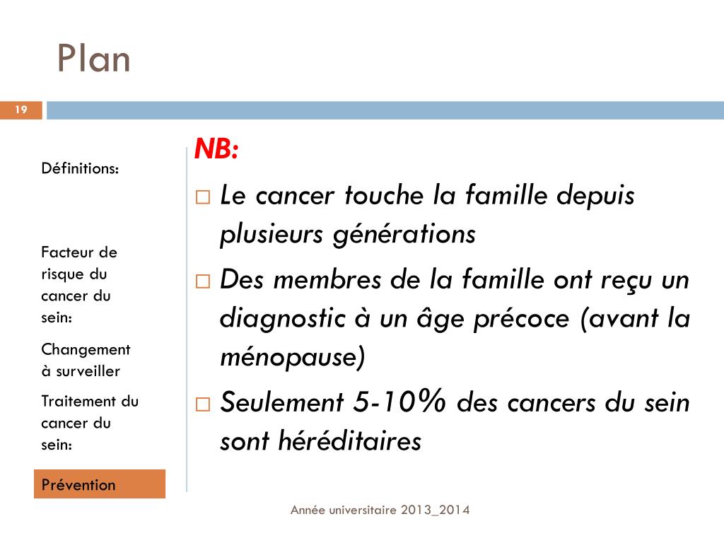 Plan NB: • Le cancer touche la famille depuis plusieurs générations • Des membres de la famille ont reçu un diagnostic à un âge précoce (avant la ménopause) • Seulement 5-10% des cancers du sein sont héréditaires Définitions: Facteur de risque du cancer du sein: Changement à surveiller Traitement du cancer du sein: Prévention Année universitaire 2013_2014