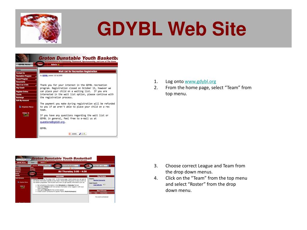 GDYBL Web Site • Log onto www.gdybl.org • From the home page, select “Team” from top menu. • Choose correct League and Team from the drop down menus. • Click on the “Team” from the top menu and select “Roster” from the drop down menu.