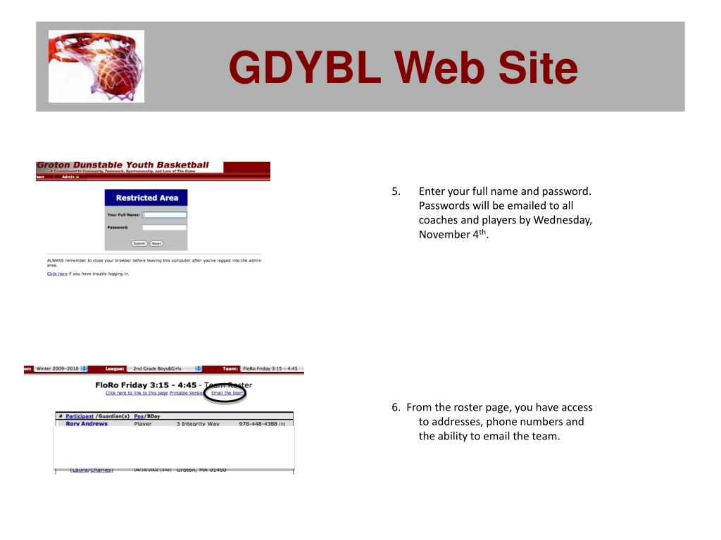 GDYBL Web Site • Enter your full name and password. • Passwords will be emailed to all coaches and players by Wednesday, November 4th. 6. From the roster page, you have access to addresses, phone numbers and the ability to email the team.