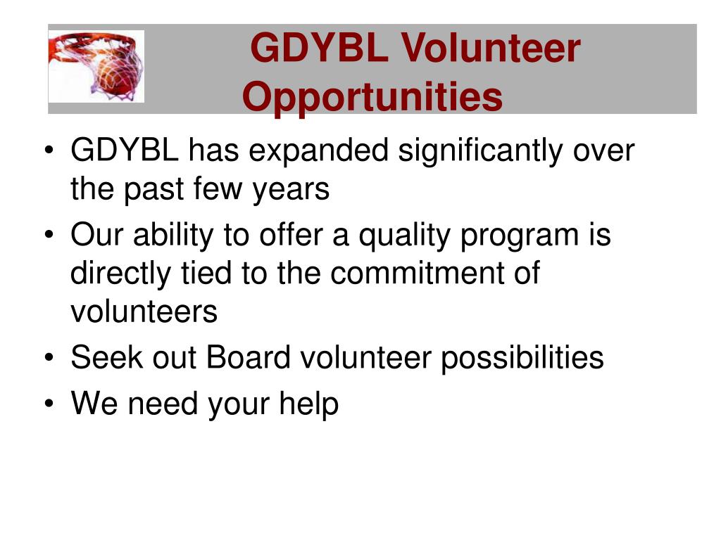 GDYBL VolunteerOpportunities • GDYBL has expanded significantly over the past few years • Our ability to offer a quality program is directly tied to the commitment of volunteers • Seek out Board volunteer possibilities • We need your help
