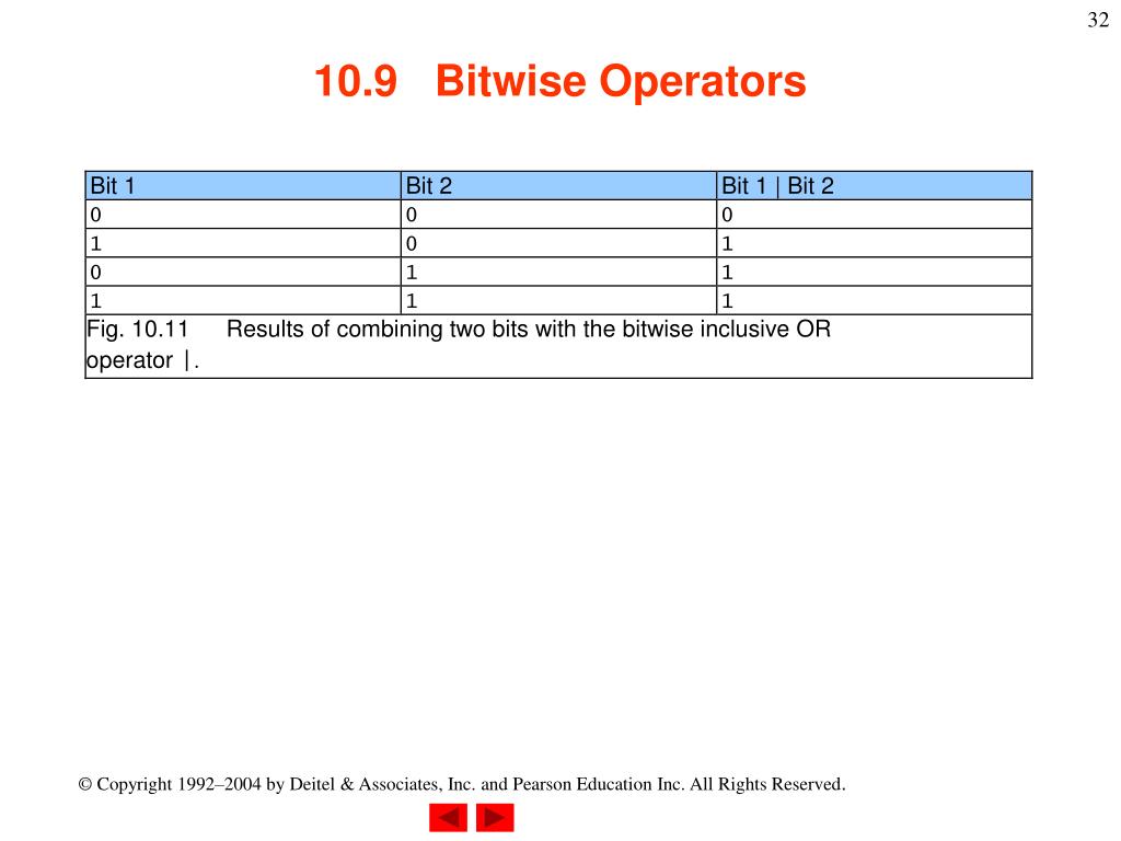 10.9 Bitwise Operators • All data represented internally as sequences of bits • Each bit can be either 0 or 1 • Sequence of 8 bits forms a byte