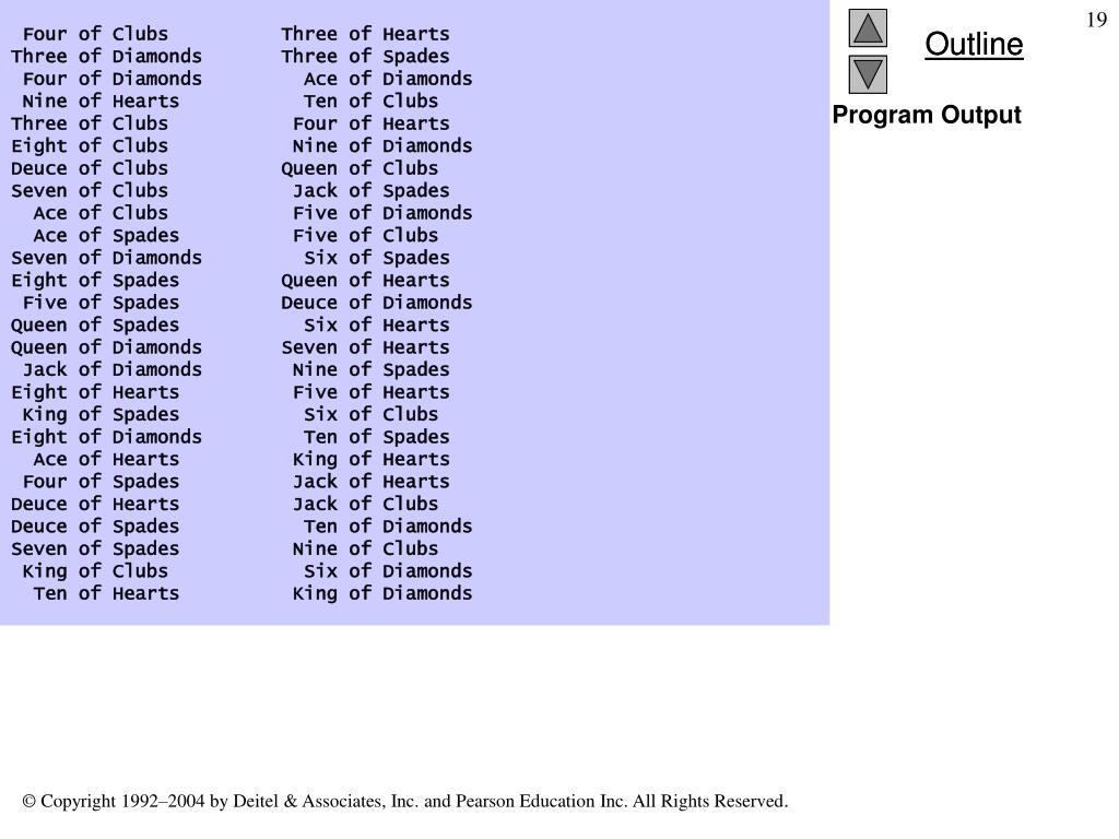 Four of Clubs Three of Hearts Three of Diamonds Three of Spades Four of Diamonds Ace of Diamonds Nine of Hearts Ten of Clubs Three of Clubs Four of Hearts Eight of Clubs Nine of Diamonds Deuce of Clubs Queen of Clubs Seven of Clubs Jack of Spades Ace of Clubs Five of Diamonds Ace of Spades Five of Clubs Seven of Diamonds Six of Spades Eight of Spades Queen of Hearts Five of Spades Deuce of Diamonds Queen of Spades Six of Hearts Queen of Diamonds Seven of Hearts Jack of Diamonds Nine of Spades Eight of Hearts Five of Hearts King of Spades Six of Clubs Eight of Diamonds Ten of Spades Ace of Hearts King of Hearts Four of Spades Jack of Hearts Deuce of Hearts Jack of Clubs Deuce of Spades Ten of Diamonds Seven of Spades Nine of Clubs King of Clubs Six of Diamonds Ten of Hearts King of Diamonds Program Output