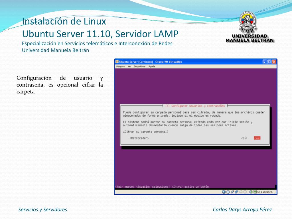 Instalación de LinuxUbuntu Server 11.10, Servidor LAMPEspecialización en Servicios telemáticos e Interconexión de RedesUniversidad Manuela Beltrán Configuración de usuario y contraseña, es opcional cifrar la carpeta Servicios y Servidores Carlos Darys Arroyo Pérez