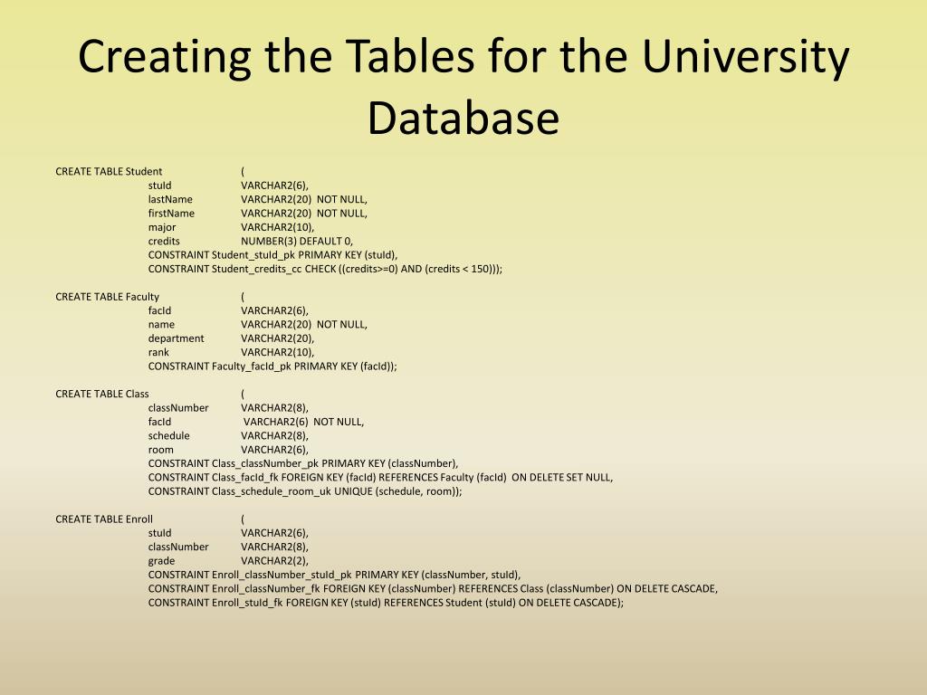 Creating the Tables for the University Database CREATE TABLE Student ( stuId VARCHAR2(6), lastName VARCHAR2(20) NOT NULL, firstName VARCHAR2(20) NOT NULL, major VARCHAR2(10), credits NUMBER(3) DEFAULT 0, CONSTRAINT Student_stuId_pk PRIMARY KEY (stuId), CONSTRAINT Student_credits_cc CHECK ((credits>=0) AND (credits < 150))); CREATE TABLE Faculty ( facId VARCHAR2(6), name VARCHAR2(20) NOT NULL, department VARCHAR2(20), rank VARCHAR2(10), CONSTRAINT Faculty_facId_pk PRIMARY KEY (facId)); CREATE TABLE Class ( classNumber VARCHAR2(8), facId VARCHAR2(6) NOT NULL, schedule VARCHAR2(8), room VARCHAR2(6), CONSTRAINT Class_classNumber_pk PRIMARY KEY (classNumber), CONSTRAINT Class_facId_fk FOREIGN KEY (facId) REFERENCES Faculty (facId) ON DELETE SET NULL, CONSTRAINT Class_schedule_room_uk UNIQUE (schedule, room)); CREATE TABLE Enroll ( stuId VARCHAR2(6), classNumber VARCHAR2(8), grade VARCHAR2(2), CONSTRAINT Enroll_classNumber_stuId_pk PRIMARY KEY (classNumber, stuId), CONSTRAINT Enroll_classNumber_fk FOREIGN KEY (classNumber) REFERENCES Class (classNumber) ON DELETE CASCADE, CONSTRAINT Enroll_stuId_fk FOREIGN KEY (stuId) REFERENCES Student (stuId) ON DELETE CASCADE);