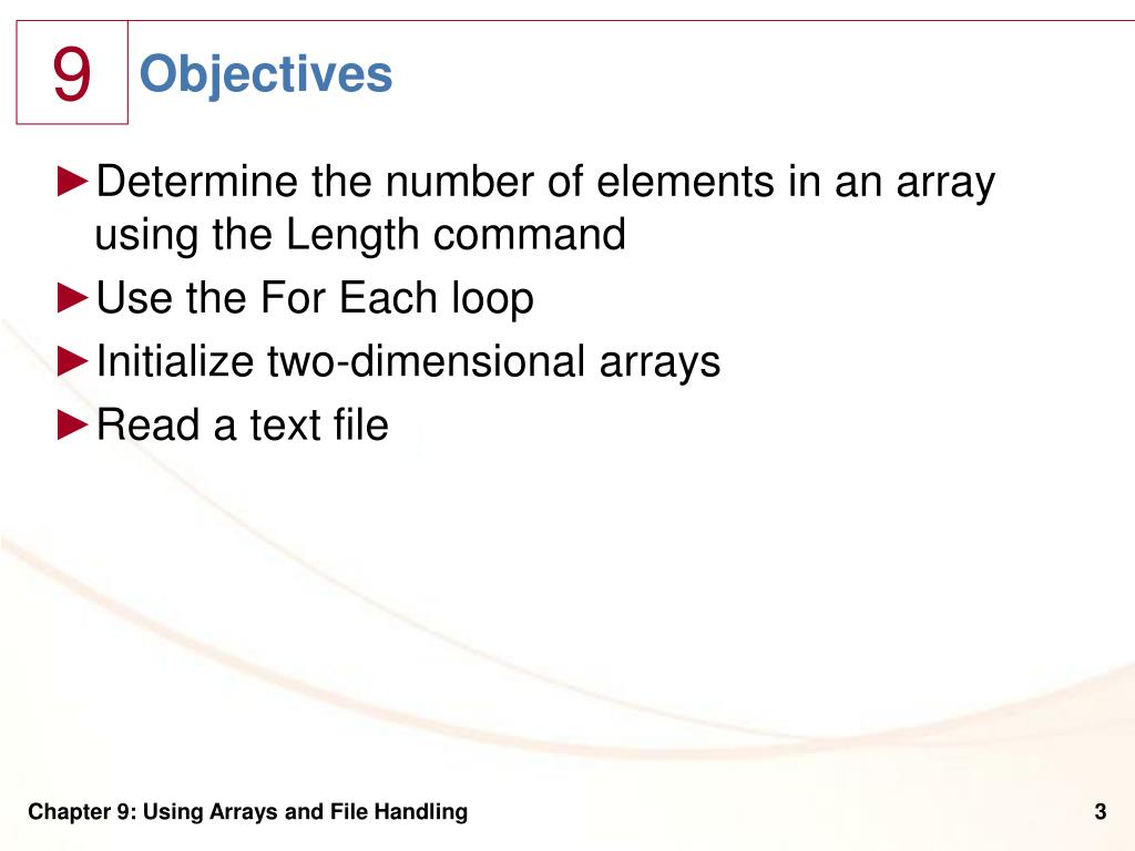 Objectives • Determine the number of elements in an array using the Length command • Use the For Each loop • Initialize two-dimensional arrays • Read a text file Chapter 9: Using Arrays and File Handling