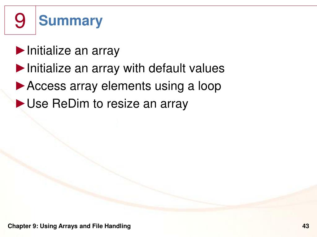 Summary Initialize an array Initialize an array with default values Access array elements using a loop Use ReDim to resize an array Chapter 9: Using Arrays and File Handling
