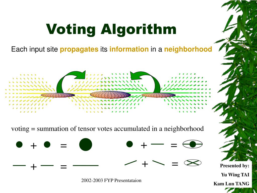 + = + = + = + = Voting Algorithm Each input site propagates its information in a neighborhood voting = summation of tensor votes accumulated in a neighborhood Presented by: Yu Wing TAI Kam Lun TANG 2002-2003 FYP Presentataion