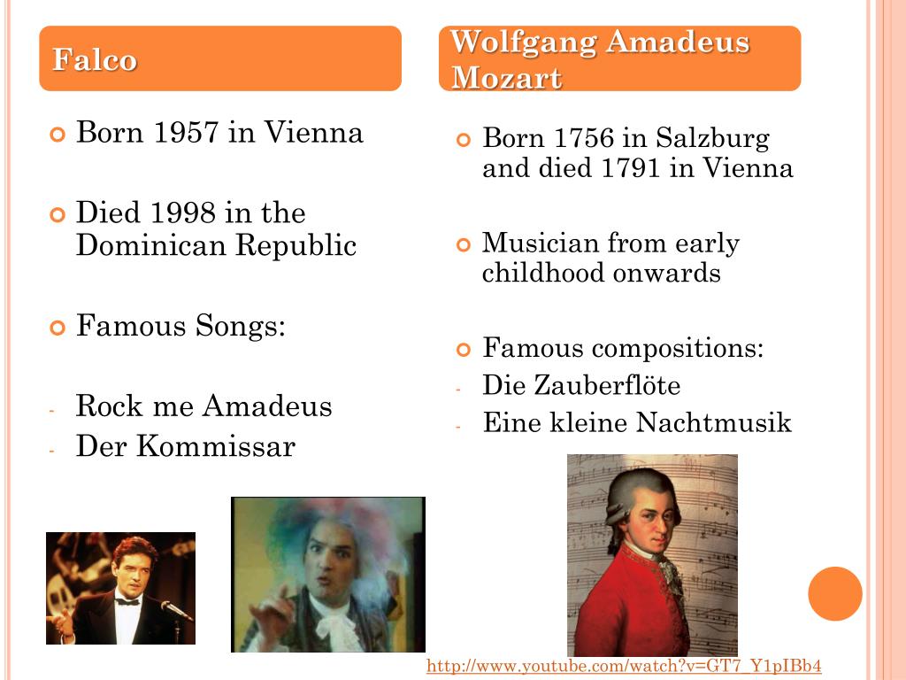Falco Wolfgang Amadeus Mozart • Born 1957 in Vienna • Died 1998 in the Dominican Republic • Famous Songs: • Rock me Amadeus • DerKommissar • Born 1756 in Salzburg and died 1791 in Vienna • Musician from early childhood onwards • Famous compositions: • Die Zauberflöte • EinekleineNachtmusik http://www.youtube.com/watch?v=GT7_Y1pIBb4