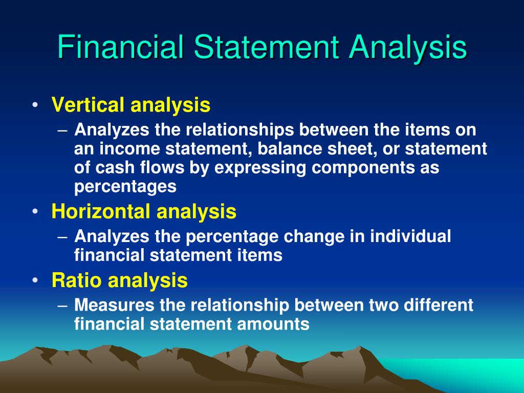 Financial Statement Analysis • Vertical analysis • Analyzes the relationships between the items on an income statement, balance sheet, or statement of cash flows by expressing components as percentages • Horizontal analysis • Analyzes the percentage change in individual financial statement items • Ratio analysis • Measures the relationship between two different financial statement amounts