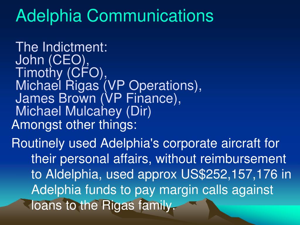 Adelphia CommunicationsThe Indictment: John (CEO), Timothy (CFO), Michael Rigas (VP Operations), James Brown (VP Finance), Michael Mulcahey (Dir) Amongst other things: Routinely used Adelphia's corporate aircraft for their personal affairs, without reimbursement to Aldelphia, used approx US$252,157,176 in Adelphia funds to pay margin calls against loans to the Rigas family.