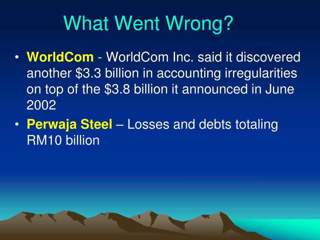 What Went Wrong? • WorldCom - WorldCom Inc. said it discovered another $3.3 billion in accounting irregularities on top of the $3.8 billion it announced in June 2002 • Perwaja Steel – Losses and debts totaling RM10 billion