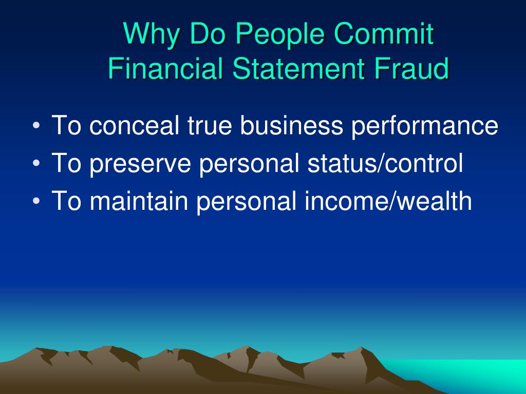 Why Do People Commit Financial Statement Fraud • To conceal true business performance • To preserve personal status/control • To maintain personal income/wealth