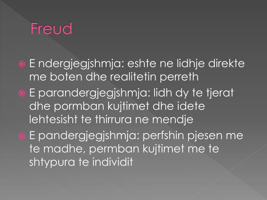 Freud • E ndergjegjshmja: eshte ne lidhje direkte me boten dhe realitetin perreth • E parandergjegjshmja: lidh dy te tjerat dhe pormban kujtimet dhe idete lehtesisht te thirrura ne mendje • E pandergjegjshmja: perfshin pjesen me te madhe, permban kujtimet me te shtypura te individit